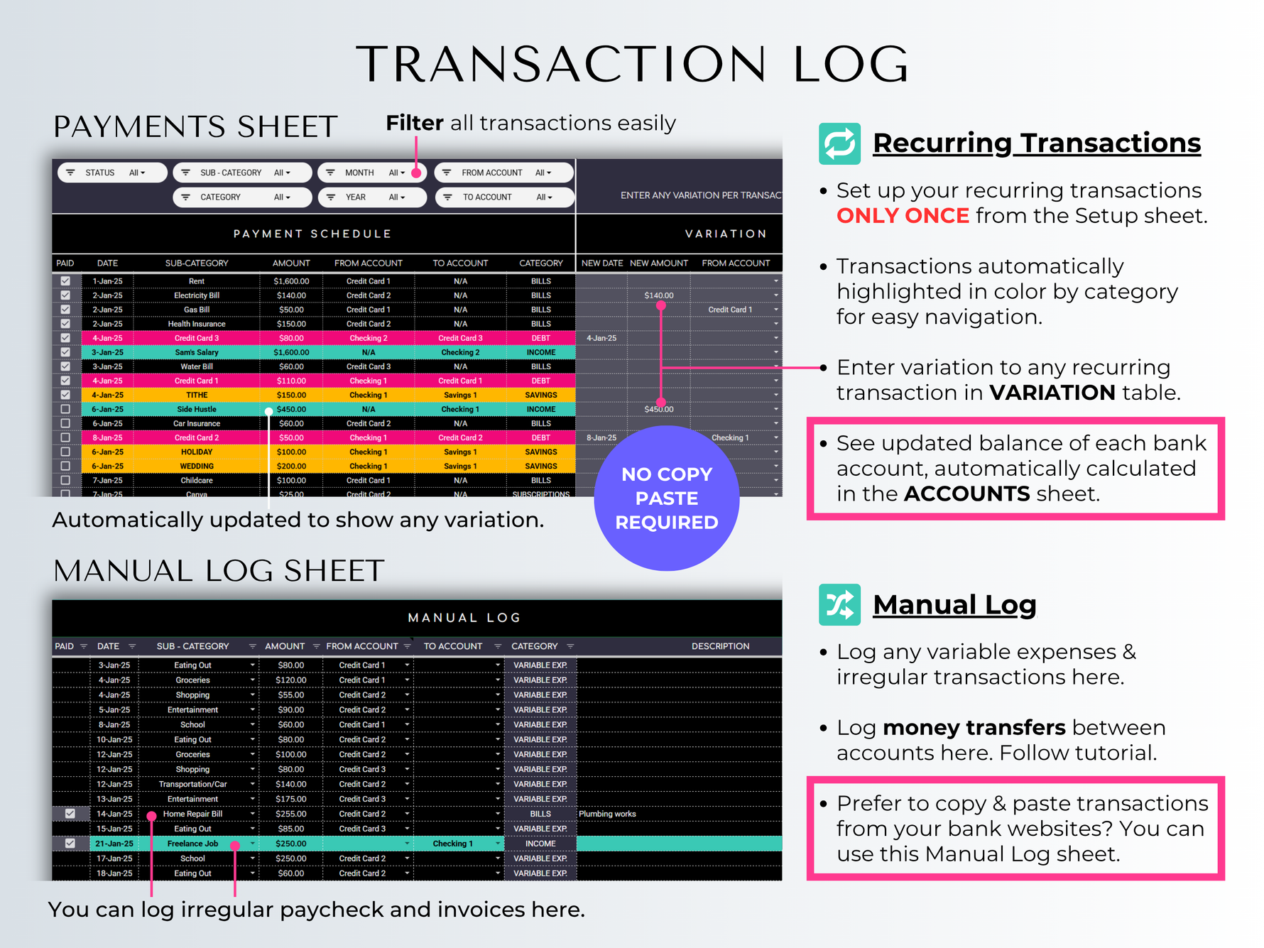 - Got an unexpected expense? Manual log handles it instantly