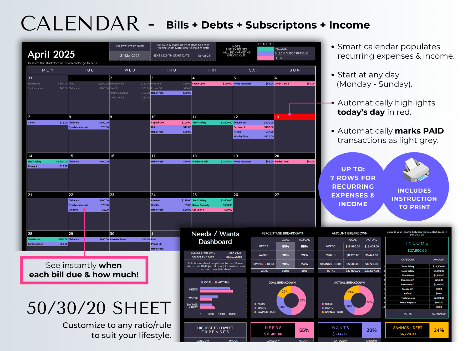 - ✓ 50/30/20 Dashboard - Follow the proven budgeting rule